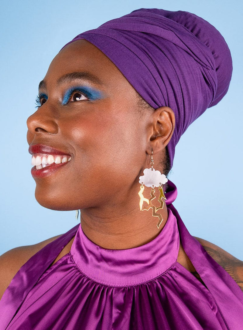 Throw shade in the Thunderstorm Cloud Earrings. Pearlescent acrylic storm clouds thunder overhead, whilst hand linked mirror acrylic lightening bolts crackle. These statement earrings will turn heads, come rain or shine.