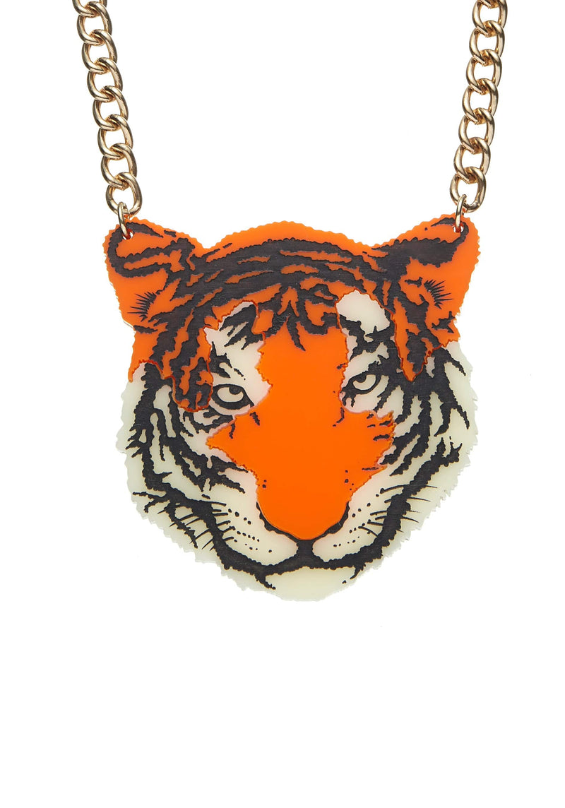 Inspired by the art of escapology and glamorous magicians, earn your stripes with Tatty Devine's iconic Tiger Necklace. Laser cut in bright orange acrylic, a tiger's face is detailed with etched and hand inked majestic markings and hangs from a chunky golden chain. Whether you're a party animal or an animal lover, style this necklace with a printed top for a really wild look.
