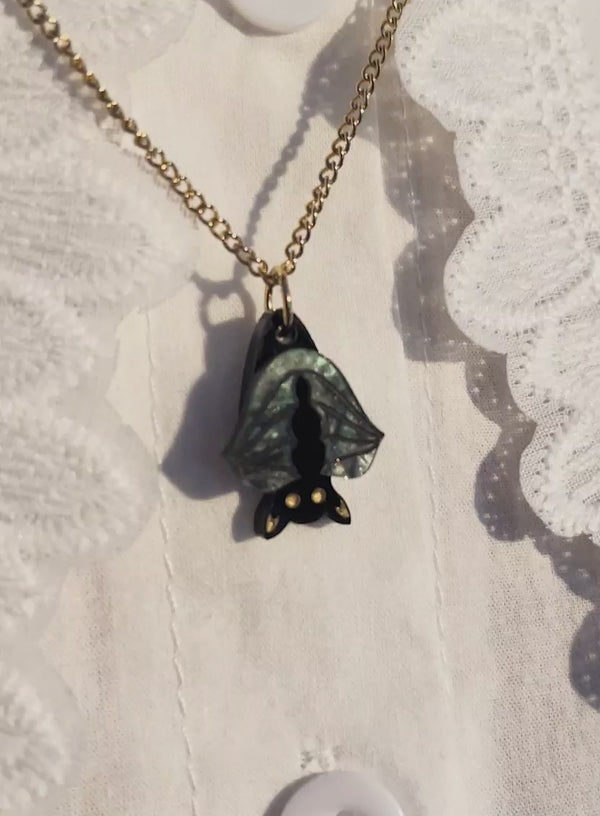 Unleash your inner creature of the night with our Vampire Bat Pendant Necklace. Swoop through the skies (or the high street) in our sleeping bat, laser cut in glossy recycled black acrylic, topped with nebula-like wings.
