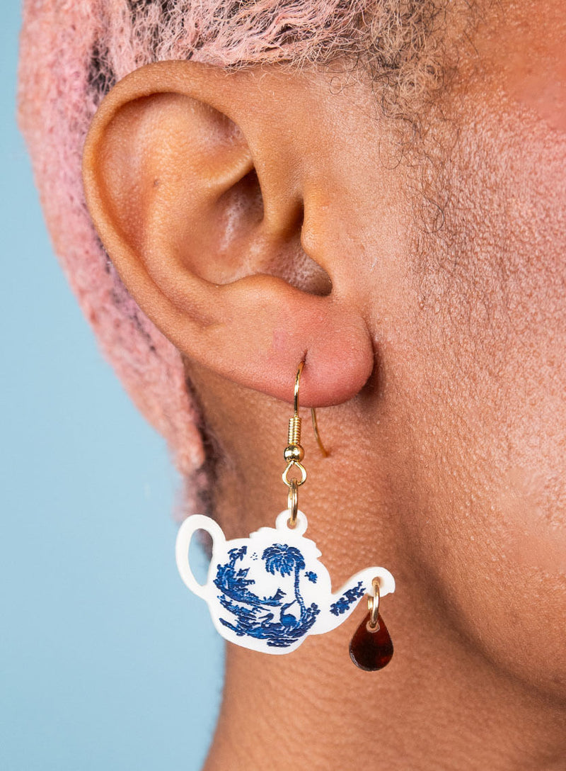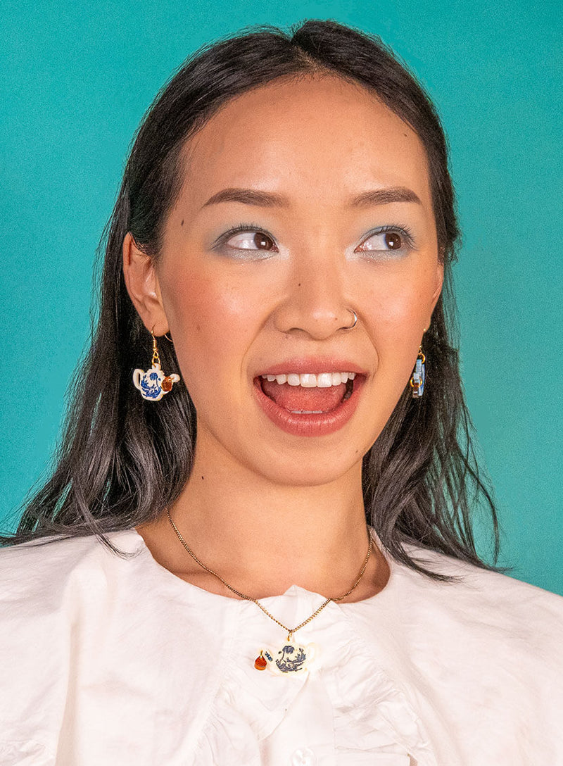 It's time for tea with our Vintage Teapot Earrings. We've created a pastel pair of teapot earrings in mismatched shades of laser cut egg-shell blue and cream acrylic, hand-inked with delicate details as seen on bone china tea sets. Perfect for afternoon tea and Fortnum & Mason, serve with triangle cut sarnies.