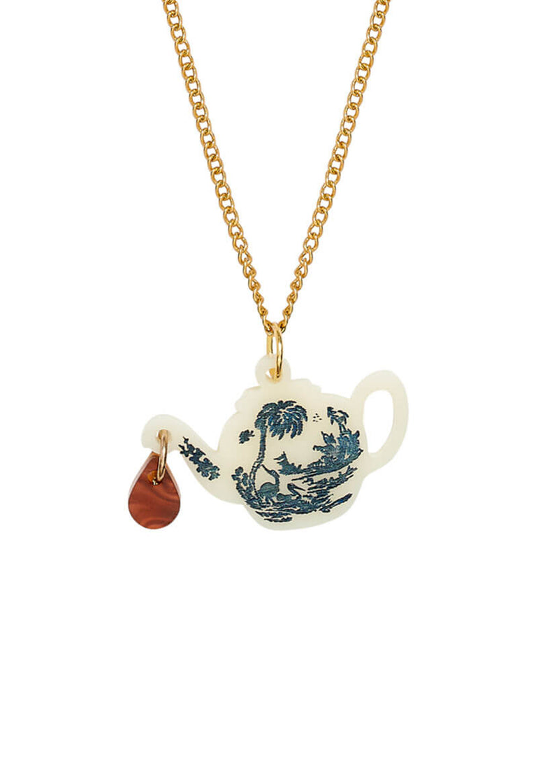 Cue oo-longing looks with our Vintage Teapot Pendant. Laser cut from creamy off-white acrylic, this must-have tea necklace is hand-inked with blue willow details and overflows with a sparkling drop of brew. Shop the full tea set and add our matching Vintage Teapot Earrings.