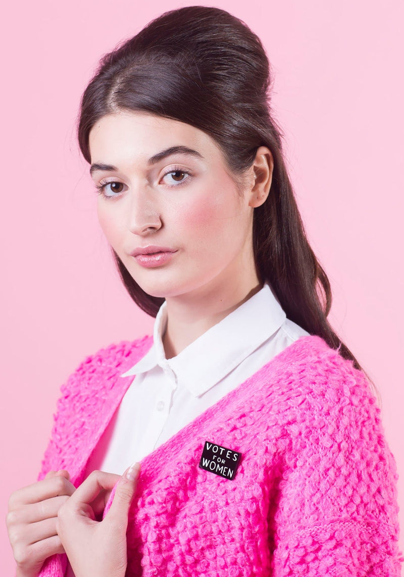Inspired by original protest banners in the Museum of London's collection, laser cut acrylic and walnut wood join forces to create wearable protest art. Set against a silver tone brooch back, this is the perfect statement brooch.