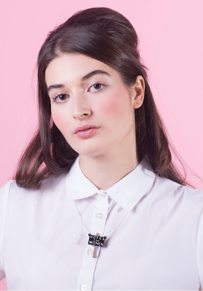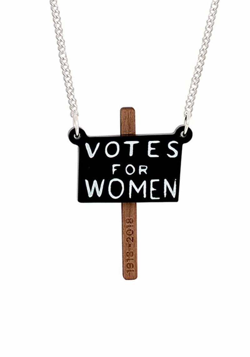 Inspired by original protest banners in the Museum of London's collection, laser cut acrylic and walnut wood join forces to create wearable protest art. '1918-2018' is etched into the stick, in celebration of Vote 100. Hung from a silver tone chain, this is the perfect statement necklace.